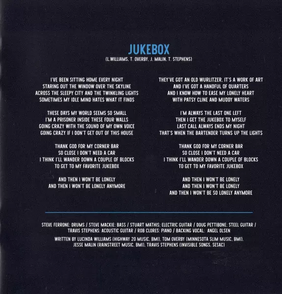 Acoustic Guitar Travis Stephens | Backing Vocals Angel Olsen | Bass Steve Mackey (3) | Drums Steve Ferrone | Electric Guitar Stuart Mathis | Piano Rob Clores | Steel Guitar Doug Pettibone | Written-By Jesse Malin, Lucinda Williams, Tom Overby, Travis Stephens