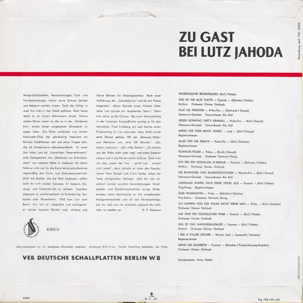 Lutz Jahoda: Zu Gast Bei Lutz Jahoda A lemezen lévő változat bakelitlemez LP - standard kiadás. Ez a különleges kiadás - Németországi Szövetségi Köztársaság a kiadó által AMIGA napján jelent meg 1963. Album műfajok között Pop és Sláger.