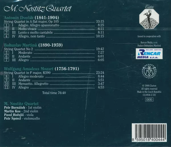 | Művész | Wolfgang Amadeus Mozart | Antonín Dvořák | Bohuslav Martinů | M. Nostitz Quartet |