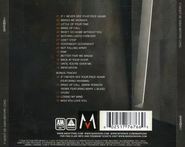 It Won't Be Soon Before Long - Maroon 5's successful album has sold more than 3 million copies worldwide, and immediately made the Top 10 LPchart here. In addition to the radio hit Won't Go Home Without You and 13 other tracks from the album, fans can look forward to 5 more bonus tracks. Among them is their current hit If I Never See Your Face A...