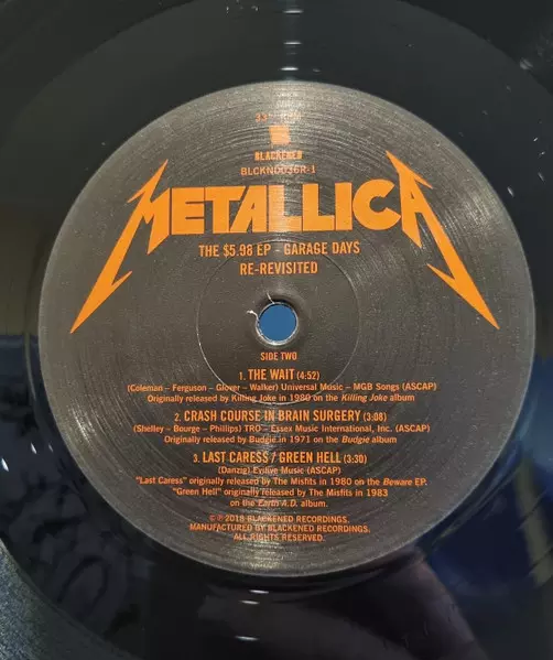 The $5.98 E.P. - Garage Days Re-Revisited is an EP by American heavy metal band Metallica , released on August 21, 1987. The EP was released independently by the band and was their first release on their own label, Blackened Recordings. The EP was recorded in Lars Ulrich's home garage in El Cerrito, California in 1987. The EP's title is a reference to the price of the tape at the time. The EP consists of five cover versions that the band chose because "they were influenced by bands we liked and we wanted to pay tribute to them". The songs are "Helpless" by Diamond Head, "The Small Hours" by Holocaust, "The Wait" by Killing Joke, "Crash Course in Brain Surgery" by Budgie and "Metal Militia" by Motörhead. The EP was met with mixed reviews from music critics. Some critics praised the band's interpretation of the songs, while others criticized the band for not writing their own material. The EP charted at number 38 on the Billboard 200 and was certified gold by the Recording Industry Association of America (RIAA).