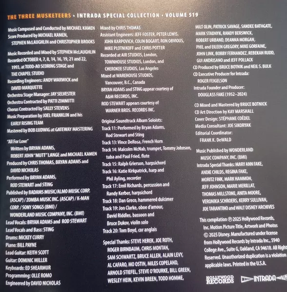 Michael Kamen: The Three Musketeers (Original Motion Picture Soundtrack) LTD A lemezen lévő változat 2CD - korlátozott példányszámban felújított kiadás. Ez a különleges kiadás - Világszerte a kiadó által Intrada év 20. június 2025. Album műfajok között Klasszikus zene, Színpad és képernyő, Contemporary classical, Score és Soundtrack.