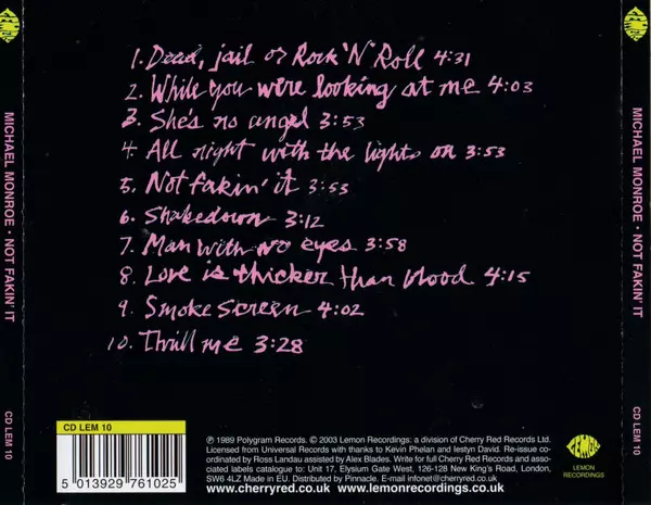 Michael Monroe: Not Fakin' It A lemezen lévő változat CD - standard kiadás. Ez a különleges kiadás - UK a kiadó által Lemon Recordings év 3. szeptember 2007. Album műfajok között Rock és Hard Rock.