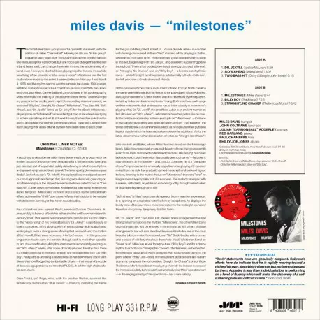 "Milestones" was recorded on April 2 and 3, 1958. "My intention," wrote Miles Davis in his autobiography, "was to continue with this sextet what we had already started with Trane, Red, Paul and myself, only I wanted to add the bluesy voice of Cannonball Adderley and thus expand the whole thing. I could imagine Cannonball's bluesy alto sax agains...