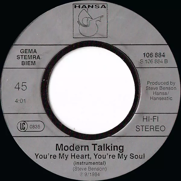 "You're My Heart, You're My Soul" je prvním a nejprodávanějším singlem skupiny Modern Talking z jejího debutového alba The 1st Album. Když byl singl v roce 1984 vydán, dostal se v Německu do Top 40 a dosáhl 9. místa. O pět týdnů později se singl dostal na 4. místo německé singlové hitparády. Na prvním místě se nakonec udržel šest týdnů a nakonec...