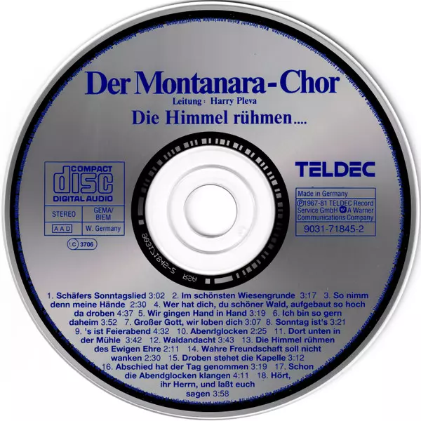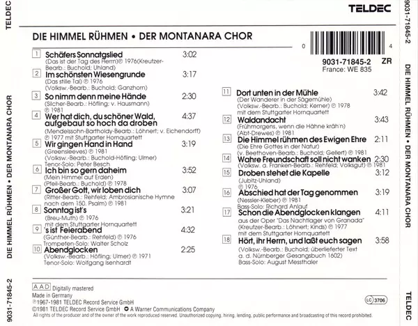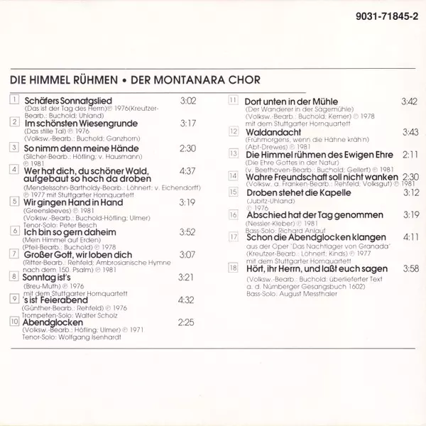 Montanara Chor: Die Himmel Rühmen… A lemezen lévő változat CD - standard kiadás. Ez a különleges kiadás - Németország a kiadó által Teldec év 11. február 2008. Album műfajok között Folk, World, & Country és Volksmusik.