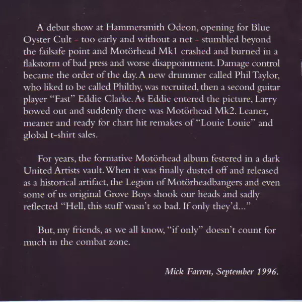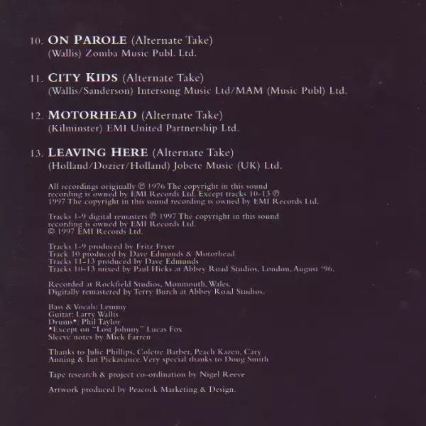 Motörhead's third album On Parole was released in 1979. It was the band's first album released on Chiswick Records and was produced by Jimmy Miller. On Parole was the band's first album to feature Phil "Philthy Animal" Taylor on drums. It was also the band's first album to feature Lemmy Kilmister singing and playing bass guitar. The album was a ...
