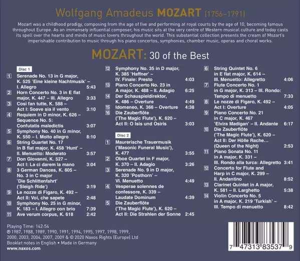 Wolfgang Amadeus Mozart: 30 Of The Best A lemezen lévő változat 2CD - standard kiadás. Ez a különleges kiadás - Európa a kiadó által Naxos év 24. április 2020. Album műfajba sorolható Klasszikus zene.