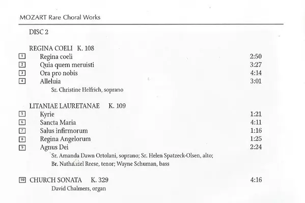 | Művész | Wolfgang Amadeus Mozart | Gloriae Dei Cantores | Elizabeth C. Patterson | Richard K. Pugsley | Vox Caeli Sinfonia |