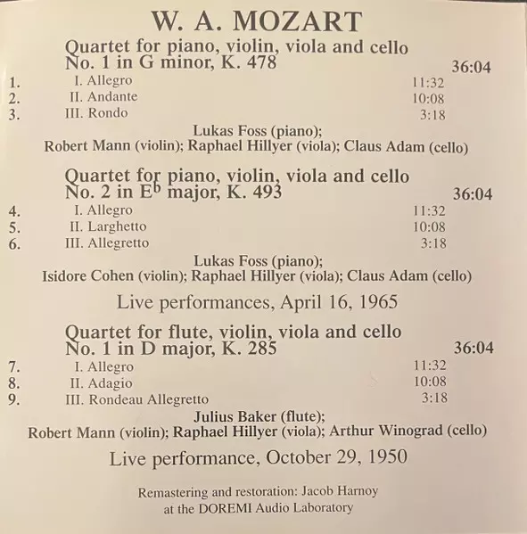 | Művész | Wolfgang Amadeus Mozart | Juilliard String Quartet | Lukas Foss | Julius Baker |