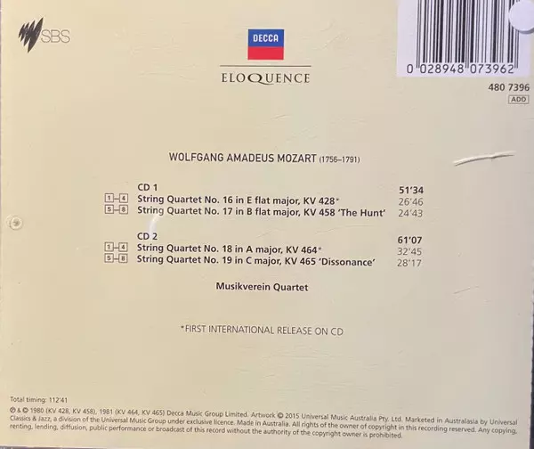 | Cím | String Quartets KV.428, KV 458, KV 464, KV 465 |