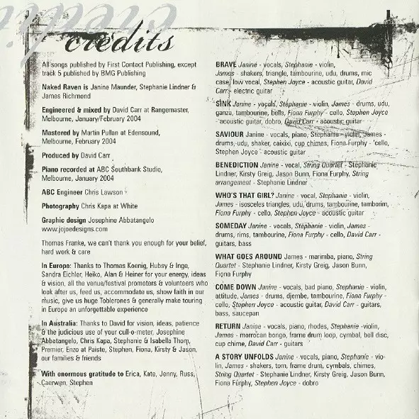 Acoustic Guitar Stephen Joyce (3) | Electric Guitar David Carr | Shaker, Triangle, Tambourine, Udu, Drums James Richmond (2) | Violin Stephanie Lindner | Vocals Janine Maunder | Written-By Janine Maunder, Stephen Joyce (3)