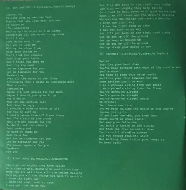 Drum Programming, Vocals [Shouting Vocals], Bells [Orchestra Bells] John Congleton | Piano, Synthesizer [Minimoog Bass], Electric Organ [Hammond B3], Keyboards, Synthesizer Adam Pickrell | Written-By Liz Rose, Natalie Hemby, Nelly Furtado