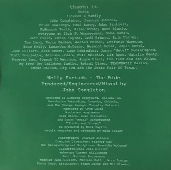 Acoustic Guitar Sean Kelly (6) | Keyboards, Guitar John Congleton | Piano, Keyboards, Synthesizer Adam Pickrell | Synthesizer [Juno 60], Mellotron, Synthesizer [Mini Moog Model D (Bass)] Bobby Sparks | Written-By John Congleton, Nelly Furtado