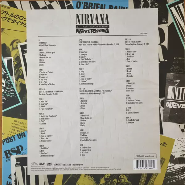 8LP - Super Deluxe contains 8 x 180-gram LPs showcasing the newly remastered album from the original analog tapes and 4 concerts on the Nevermind Tour from Amsterdam, Netherlands; Del Mar, California; Melbourne, Australia and Tokyo, Japan. Also included is a first-ever 7-inch for „Endless, Nameless” with B-sides „Even In His Youth” and „Aneurysm,” and a 40-page hardcover book with unreleased photos.
