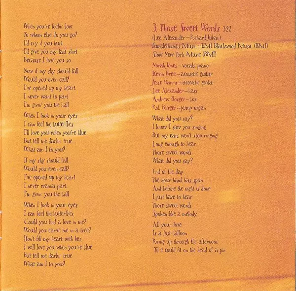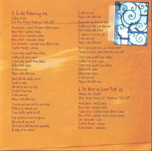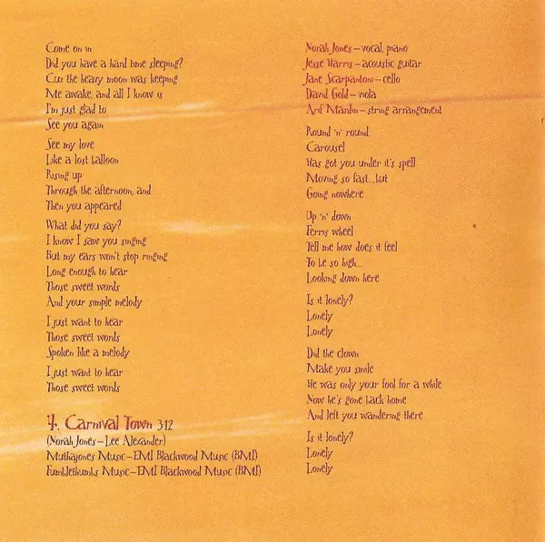 Acoustic Guitar Jesse Harris, Kevin Breit | Bass Lee Alexander | Drum [Box] Andrew Borger | Pump Organ Rob Burger | Vocals, Piano Norah Jones | Written-By Lee Alexander, Richard Julian