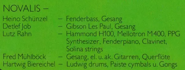 Novalis was a German progressive rock band that became one of the prominent representatives of the 1970s Krautrock movement. Named after the 18th-century poet Georg Philipp Friedrich Freiherr von Hardenberg, who used the pen name "Novalis," the band was formed in the early 1970s. T...
