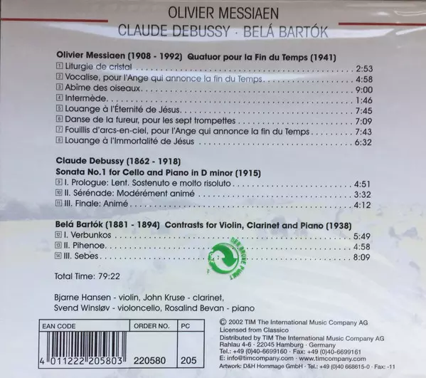 | Művész | Claude Debussy | Béla Bartók | Olivier Messiaen | Svend Winsløv | Rosalind Bevan | John Kruse | Bjarne Hansen |
