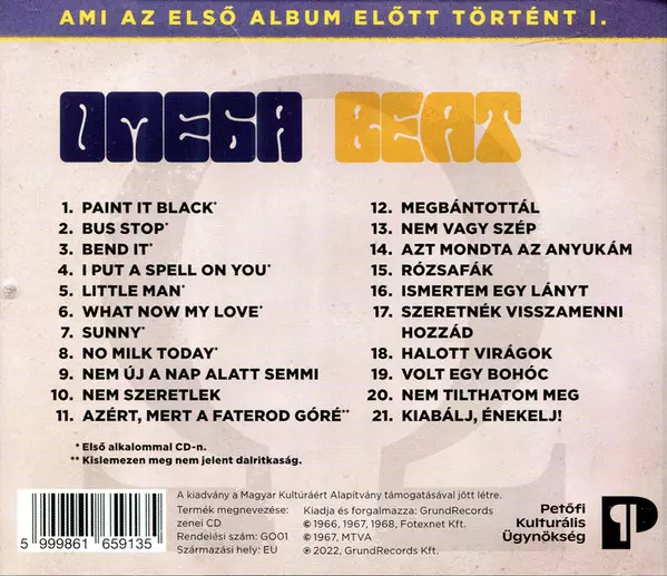 Omega: Beat A lemezen lévő változat CD - standard kiadás. Ez a különleges kiadás - Magyarország a kiadó által GrundRecords év 15. augusztus 2022. Album műfajba sorolható Rock.