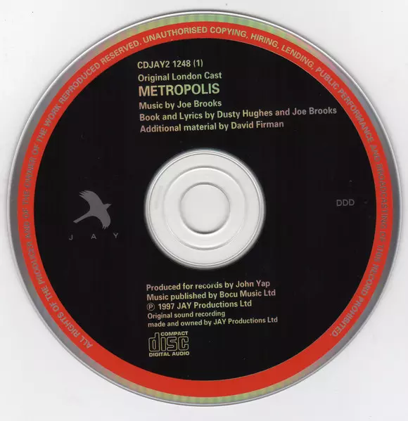 "Metropolis" Original London Cast: Metropolis A lemezen lévő változat 2CD - standard kiadás. Ez a különleges kiadás - USA, Kanada és az Egyesült Királyság a kiadó által Jay Records (4) év 22. április 1997. Album műfajok között Színpad és képernyő és Musical. Surround.
