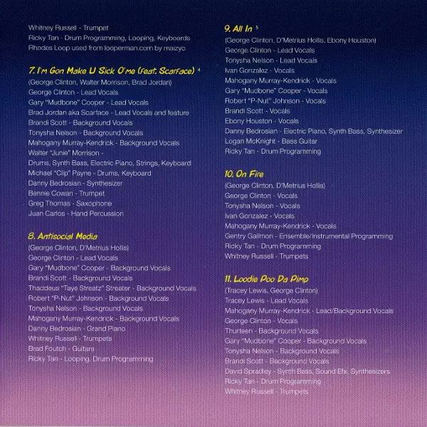 Backing Vocals [Background Vocals] Brandi "Nakid" Scott, Gary Mudbone Cooper, Mahogany Murray-Kendrick, Robert "P-Nut" Johnson, Thaddeus Streater, Tonysha Nelson | Drum Programming, Loops [Looping] Ricky Tan | Grand Piano Danny Bedrosian | Guitar Bradley Jay Foutch | Trumpet Whitney Russell | Written-By D'Metrius Hollis | Written-By, Lead Vocals George Clinton