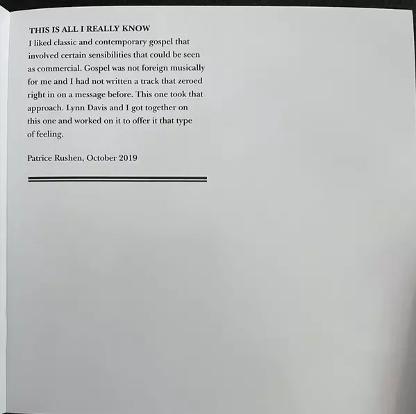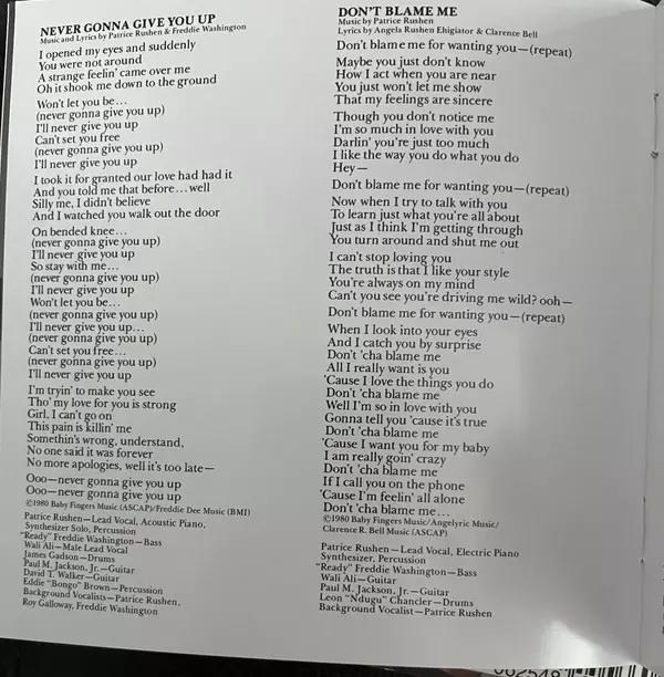 Backing Vocals Jim Gilstrap, Lynn Davis, Roy Galloway | Bass Freddie Washington | Drums Gerry Brown | Electric Piano, Piano [Acoustic] Patrice Rushen | Guitar Marlo Henderson, Paul Jackson Jr. | Recorded By [Rhythm] Jeff Titmus