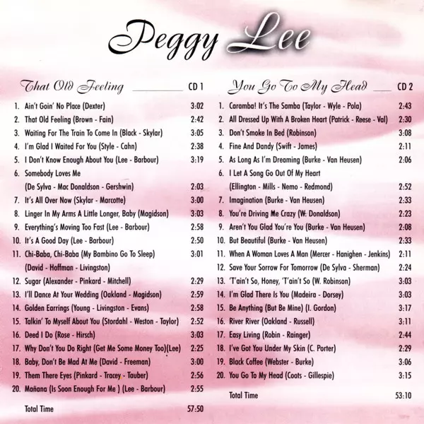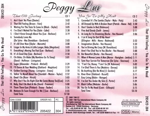 Peggy Lee: That Old Feeling - You Go To My Head A lemezen lévő változat 2CD - standard kiadás. Ez a különleges kiadás - Németország a kiadó által Past Perfect Jazz Line év 10. december 2018. Album műfajok között Pop, Jazz, Ének és Big Band.
