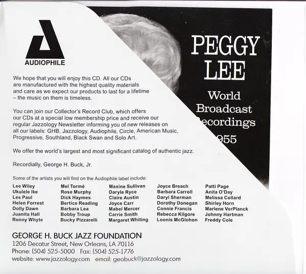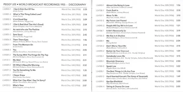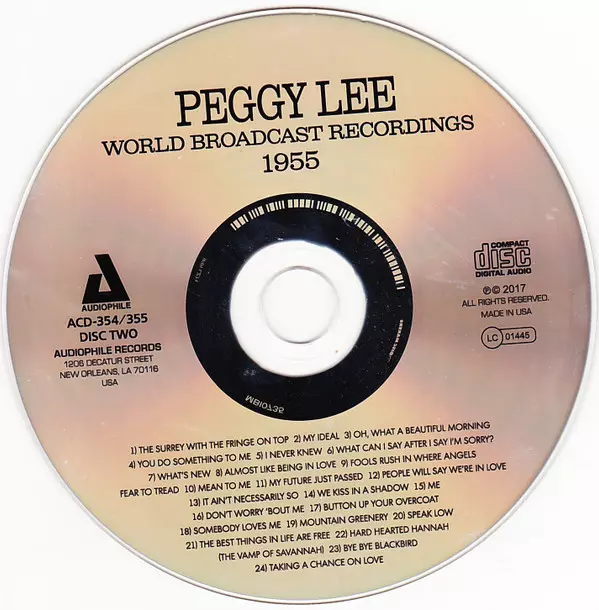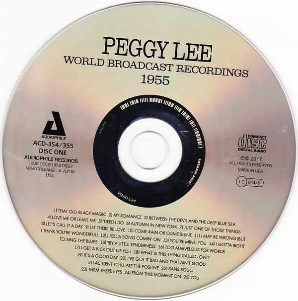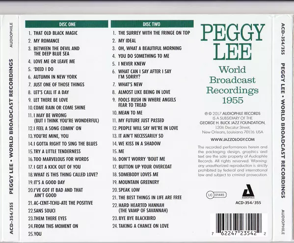 Peggy Lee: World Broadcast Recordings 1955 A lemezen lévő változat 2CD - felújított kiadás. Ez a különleges kiadás a kiadó által Audiophile (2) év 2. november 2017. Album műfajok között Pop, Jazz és Ének.