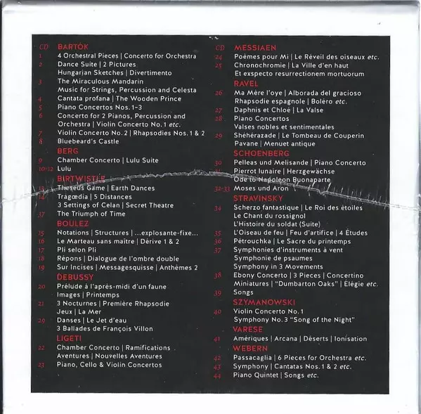 | 44-1 | BBC Singers, Ensemble Intercontemporain, Pierre-Laurent Aimard, Christiane Oelze, Françoise Pollet: Piano Quintet | Entflieht Auf Leichten Kahnen | 2 Lieder | 5 Pieces For Orchestra | 4 Lieder | 6 Lieder | 5 Sacred Songs | 5 Can | 69:27 min | |