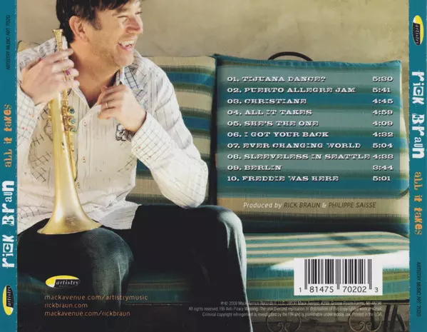 Rick Braun: All It Takes A lemezen lévő változat CD - standard kiadás. Ez a különleges kiadás - USA a kiadó által Artistry Music év 30. július 2009. Album műfajok között Jazz és Contemporary Jazz.