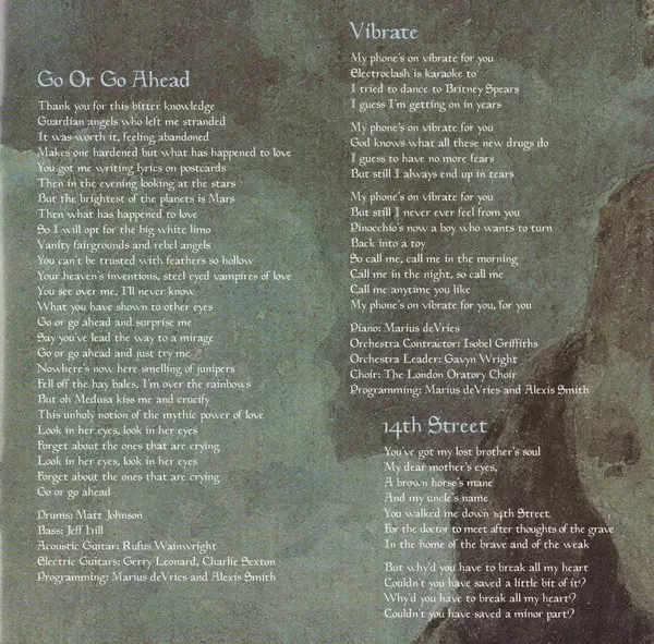Bass Jeff Hill | Bass Trombone Dave Stewart (2) | Bassoon Daniel Shelly | Brass The Kick Horns | Clarinet David Sapadin | Contractor [Orchestra Contractor] Isobel Griffiths | Drums Sterling Campbell | Flute Simon Clarke (2) | Guitar Charlie Sexton, Gerry Leonard, Jimi Zhivago | Harp Joy Smith | Leader [Orchestra Leader] Gavyn Wright | Oboe Alexandra Knoll | Piano Rufus Wainwright | Programmed By Alexis Smith, Marius de Vries | Trombone Annie Whitehead | Trumpet Paul Spong, Roddy Lorimer