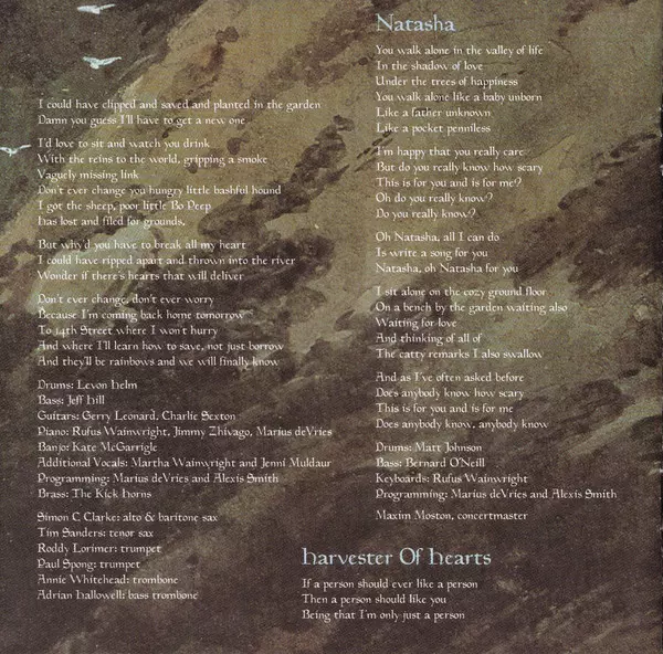 Alto Saxophone, Baritone Saxophone Simon Clarke (2) | Banjo Kate McGarrigle | Bass Jeff Hill | Bass Trombone Adrian Hallowell | Brass The Kick Horns | Drums Levon Helm | Guitar Charlie Sexton, Gerry Leonard | Piano Jimi Zhivago, Marius de Vries, Rufus Wainwright | Programmed By Alexis Smith, Marius de Vries | Tenor Saxophone Tim Sanders | Trombone Annie Whitehead | Trumpet Paul Sprong, Roddy Lorimer | Vocals [Additional] Jenni Muldaur, Martha Wainwright