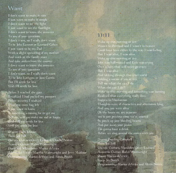 Acoustic Guitar Rufus Wainwright | Bass Jeff Hill | Drums Sterling Campbell | Electric Guitar Charlie Sexton, Gerry Leonard, Jimi Zhivago | Programmed By Alexis Smith, Marius de Vries