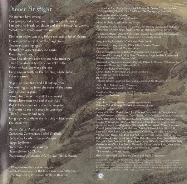 Accordion Kate McGarrigle | Contractor [Orchestra Contractor] Isobel Griffiths | Flute Simon Clarke (2) | Harp Joy Smith | Leader [Orchestra Leader] Gavyn Wright | Piano Rufus Wainwright | Programmed By Alexis Smith, Marius de Vries