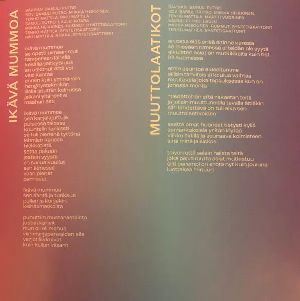 Samuli Putro: Ikävä Mummoa A lemezen lévő változat CD - standard kiadás. Ez a különleges kiadás - Finnország a kiadó által Johanna Kustannus év 10. március 2023. Album műfajok között Rock, Pop, Pop Rock és Indie-Pop.