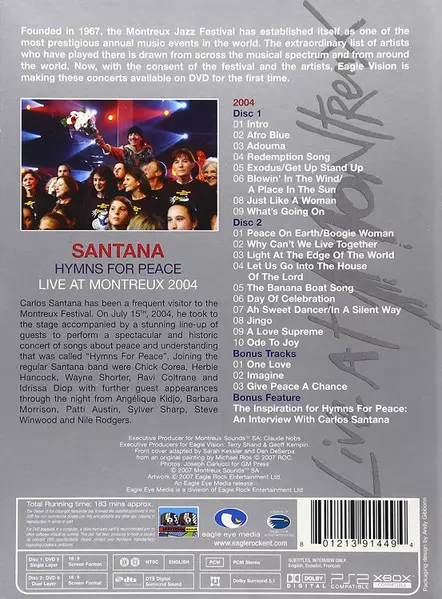 Santana: Hymns For Peace Live At Montreux 2004 DIGI A lemezen lévő változat 2DVD - digipack kiadás. Ez a különleges kiadás - USA a kiadó által Eagle Eye Media év 1. május 2007. Album műfajok között Rock, Pop, Jazz, Latin zene, Jazz-Rock és Concert Film.