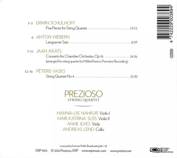 | Művész | Erwin Schulhoff | Anton Webern | Pēteris Vasks | Jaan Rääts | String Quartet Prezioso |