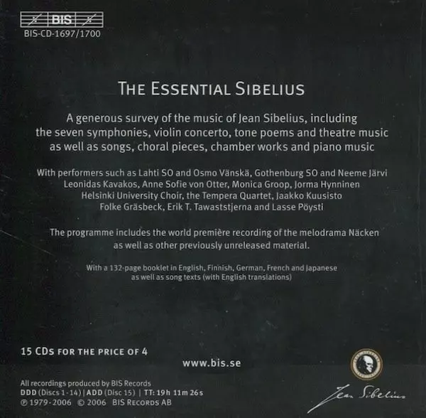 Jean Sibelius: The Essential Sibelius A lemezen lévő változat 15CD/Dobozkészlet - standard kiadás. Ez a különleges kiadás - Európa a kiadó által BIS év 8. február 2007. Album műfajok között Klasszikus zene és Románcok.