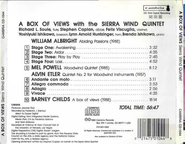 | Művész | Mel Powell | William Albright | Sierra Wind Quintet | Barney Childs | Alvin Etler |