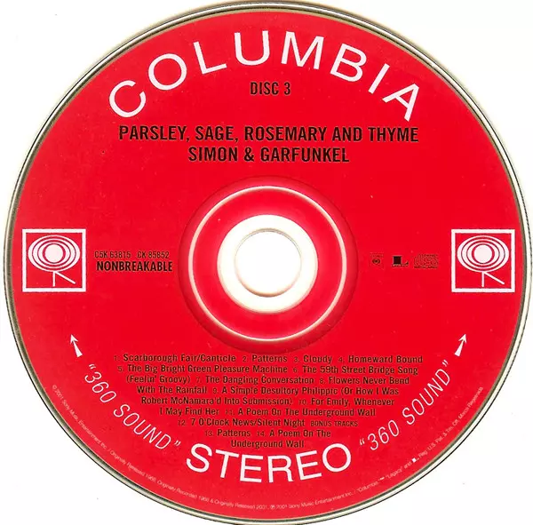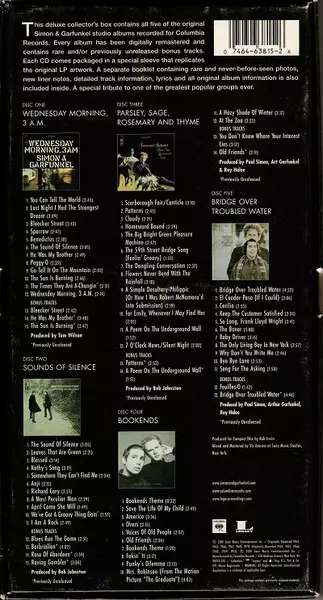 Simon & Garfunkel: The Columbia Studio Recordings 1964-1970 LTD A lemezen lévő változat 5CD/Dobozkészlet - felújított korlátozott példányszámban kiadás. Ez a különleges kiadás - USA a kiadó által Columbia a következőkkel együttműködve Legacy év 21. augusztus 2001. Album műfajok között Rock, Pop, Folk, World, & Country, Pop Rock, Folk, Country, Chanson és Classic Rock. Cardbox Sleeve Limited Edition.
