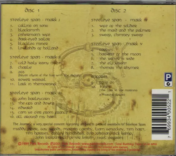 Steeleye Span: The Journey A lemezen lévő változat 2CD - standard kiadás. Ez a különleges kiadás - UK a kiadó által Park Records év 2. október 2001. Album műfajok között Folk, World, & Country, Folk Rock és Kelta zene.