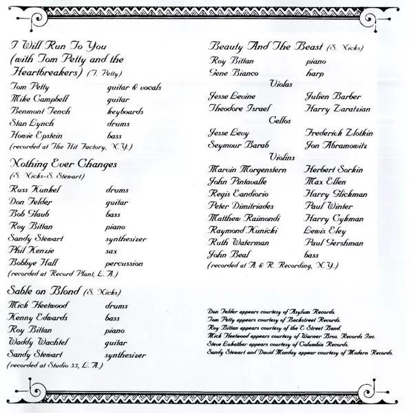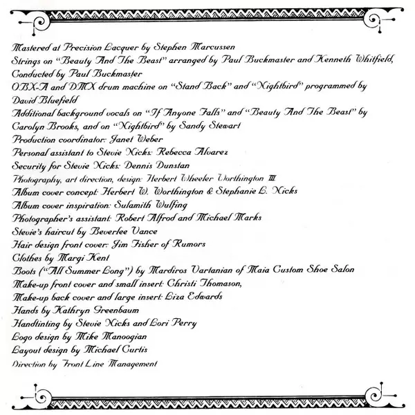Arranged By [Strings Arranged By] Kenneth Whitfield, Paul Buckmaster | Backing Vocals [Additional Background Vocals] Carolyn Brooks | Bass John Beal | Cello [Cellos] Fred Zlotkin, Jesse Levy, Jonathan Abramowitz, Seymour Barab | Conductor [Strings Conducted By] Paul Buckmaster | Harp Gene Bianco | Piano Roy Bittan | Viola [Violas] Harry Zaratzian, Jesse Levine, Julien Barber, Theodore Israel | Violin [Violins] Harry Cykman, Harry Glickman, Herbert Sorkin, John Pintavalle, Lewis Eley, Marvin Morgenstern, Matthew Raimondi, Max Ellen, Paul Gershman, Paul Winter, Peter Dimitriades, Raymond Kunicki, Regis Iandiorio, Ruth Waterman | Written-By Stevie Nicks