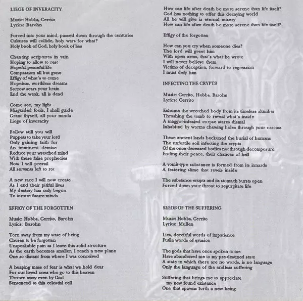 Suffocation debutové album Effigy of the Forgotten je deathmetalovou klasikou. Album vydané v roce 1991 je brutální, technické a temné. Skladby jako "Infecting the Crypts" a "Breeding the Spawn" patří k nejkultovnějším písním kapely a album si musí poslechnout každý fanoušek death metalu.