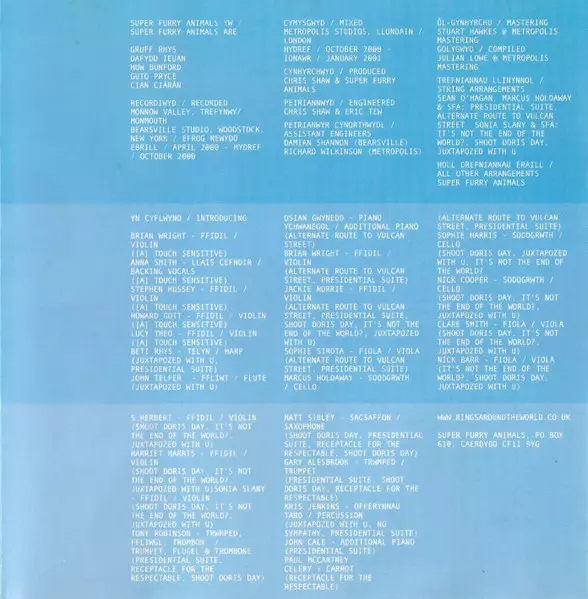 Arranged By [String Arrangements] Marcus Holdaway, Sean O'Hagan, Super Furry Animals | Cello Marcus Holdaway, Nick Cooper | Harp Beti Rhys | Percussion Kris Jenkins | Piano [Additional] John Cale | Saxophone Matt Sibley | Trumpet Gary Alesbrook | Trumpet, Flugelhorn, Trombone Tony Robinson (3) | Viola Sophie Sirota | Violin Brian Wright, Jacqueline Norrie