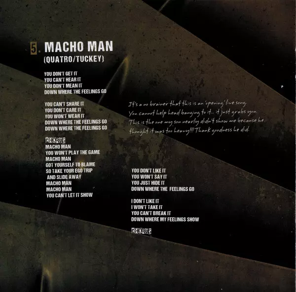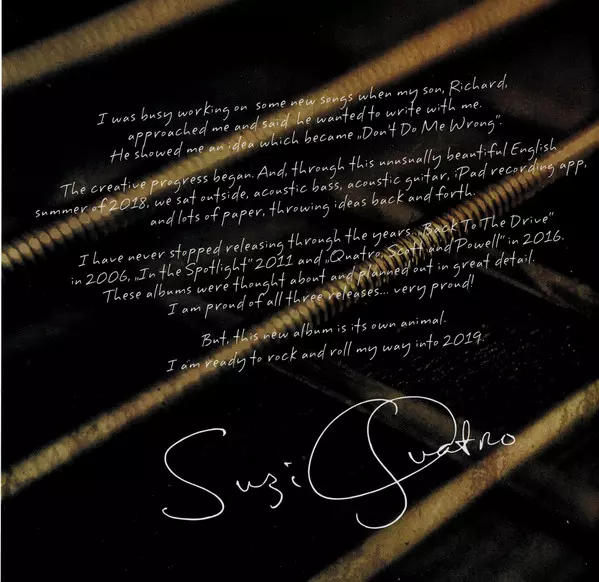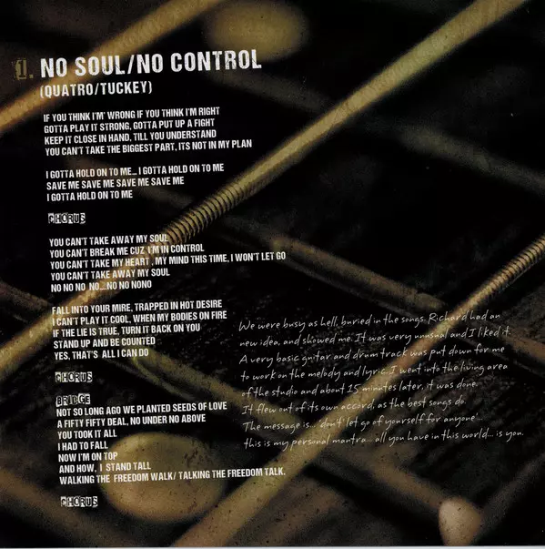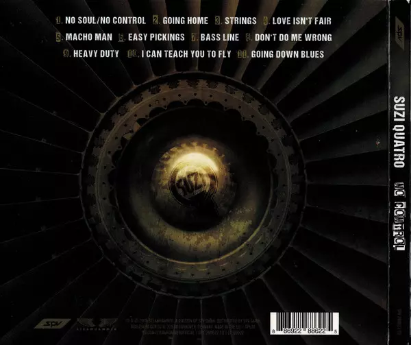Még a magas adrenalinszintű zenei szakmában is ritkán találni olyan kirobbanó energiát, mint a Suzi Quatro. Az amerikai 14 éves kora óta, több mint 50 éve van jelen a színpadon, rendszeresen robbantja nagy slágereit, mint a "Can The Can", "48 Crash", "Devil Gate Drive", "If You Can't Give Me Love", "She's In Love With You" és "Stumblin' In", amelyek a 70-es években ikonná tették, és továbbra is új dalokkal kápráztatja el rajongóit. Nem csoda, hogy nem gondolkodik a távozáson. "Addig nem vonulok vissza, amíg meg nem fordulok, meg nem rázom a seggem és nem leszek csendben" - magyarázza, jól tudva, hogy addig még sok idő telik el. Suzi Quatro Tizenegy új dalt (plusz két bónusz számot) vett fel a "No Control" című albumra. A legtöbb dalban Richard Tuckeyval, az első házasságából származó fiával dolgozott együtt. Suzi: "Ez volt az első kísérletünk arra, hogy közösen írjunk és vegyünk fel valamit. A kreatív fejlődés a Don't Do Me Wrong című dallal kezdődött. A gyönyörű 2018-as angol nyáron kint ültünk egy akusztikus basszusgitárral, akusztikus gitárral, egy iPad-en lévő felvételi alkalmazással és rengeteg papírral, és ötleteket dobáltunk egymásnak." Méghozzá remek eredménnyel, ahogy az új albumon is hallható. Suzi számára egyébként nem csak zeneileg, hanem személyesen is. Például az első kislemezdalban, a "No Soul/No Control"-ban, amelynek üzenete: "Soha ne add fel másért". Suzi: "Ez az én személyes mantrám. A legértékesebb dolog, amid van a világon, az te magad vagy". A szám keletkezéséről így nyilatkozik: "Erősen foglalkoztak bennünket az aktuális dalok. Richardnak volt egy új ötlete, és megmutatta nekem. Egy elég egyszerű dal gitárral és dobokkal, elég szokatlan, de tetszett. Bementem a stúdióba, és 15 perc után megtaláltam a megfelelő dallamot és szöveget. A szám megírta magát, ahogy a legjobb dalok gyakran teszik." Hasonlóan az olyan számokkal, mint a "Macho Man" (Suzi: "Valószínűleg a tökéletes koncertnyitó. Csak rázod rá a sörényedet, azonnal magával ragad."), az "I Can Teach You Teach You To Fly" ("Határozottan egy visszautalás a hatvanas évekre"), az "Easy Pickings" ("Ezt a riffet örökké pengetem az akusztikus gitáromon, legalább tíz éve. Az album talán legszokatlanabb száma a "Strings", amely a stúdiófelvételek során egy kis remekművé fejlődött. Suzi: "A húrokról szól, amelyek összetartják az életünket. Nagyszerű riff! Mindenkit megőrjítettem azzal az őrült ötletemmel, hogy énekeljük el a refrént. Nem tudtam kiverni a fejemből, és - halleluja - az eredmény pontosan olyan lett, amilyennek elképzeltem". A "No Control" című dalból árad a büszkeség Suzi Quatro. Büszkeség és öröm egy öt évtizeden átívelő karrierben, amely mind a mai napig megőrzi egy amerikai rockikon kreativitását. Azt mondja: "Az évek során sosem hagytam abba az új lemezek készítését. "Back To The Drive" 2006-ban, "In The Spotlight" 2011-ben, "Quatro, Scott & Powell" 2016-ban. Ezeket a műveket gondosan megterveztem és a legapróbb részletekig átgondoltam. Mindháromra büszke vagyok, sőt, nagyon büszke. De az új albumom, a 'No Control' valami egészen más."