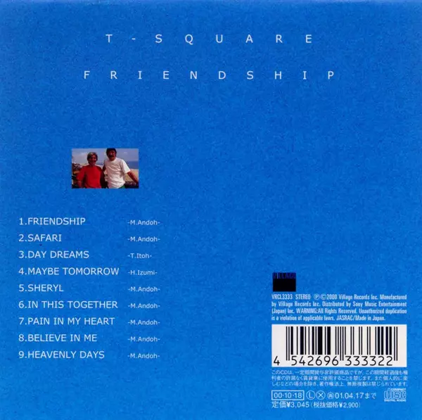 T-Square: Friendship A lemezen lévő változat CD - standard kiadás. Ez a különleges kiadás - Japán a kiadó által Village Records (2) év 18. október 2000. Album műfajok között Jazz, Fusion és Smooth Jazz.