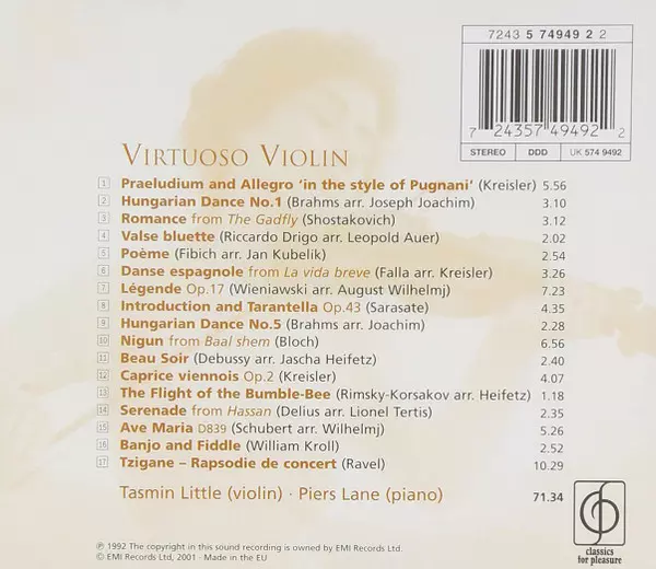 Piers Lane: Virtuoso Violin A lemezen lévő változat CD - standard kiadás. Ez a különleges kiadás - Európa a kiadó által EMI Records Ltd. a következőkkel együttműködve Classics For Pleasure év 2. április 2002. Album műfajba sorolható Klasszikus zene.