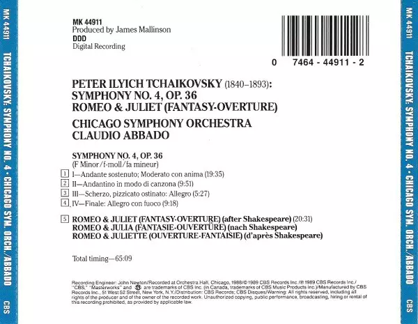 | Cím | Symphony No. 4; Romeo & Juliet (Fantasy-Overture) |