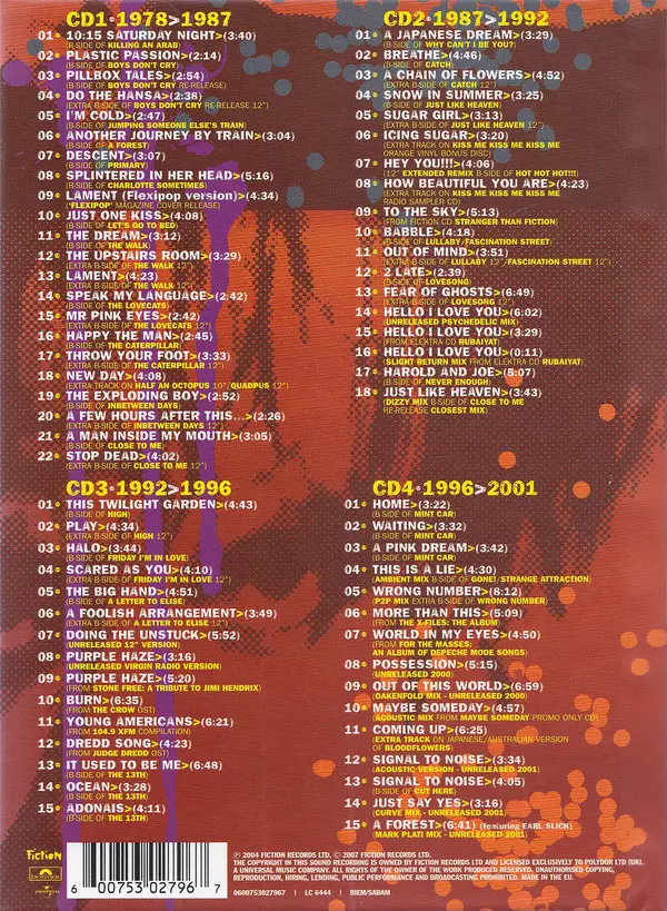 The Cure: Join The Dots (B-Sides & Rarities 1978>2001 The Fiction Years) A lemezen lévő változat 4CD - felújított kiadás. Ez a különleges kiadás - Európa a kiadó által Fiction Records a következőkkel együttműködve Polydor és Universal év 29. október 2007.