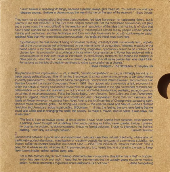 The Ex: Instant A lemezen lévő változat 2CD - standard kiadás. Ez a különleges kiadás - Európa a kiadó által Ex Records év 28. március 2011. Album műfajok között Rock, Elektronikus zene, Jazz, Experimental, Avant-garde és Free Improvisation.
